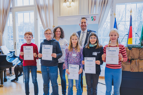 Emilie, Ida, Marlene, Leonard und Noah aus der Klasse 6a hatten am 2. Juli 2025, dem heißesten Tag des Jahres, knifflige Mathematikaufgaben gelöst. Mit ihren herausragenden Leistungen setzten sich die Fünf gegen Teams aus ganz NRW durch und wurden Sieger der Jahrgangsstufen 5 und 6. Regierungspräsident Thomas Schürmann ehrte das Team vom NGB im prunkvollen Plenarsaal der Bezirksregierung Düsseldorf. Herzlichen Glückwunsch!