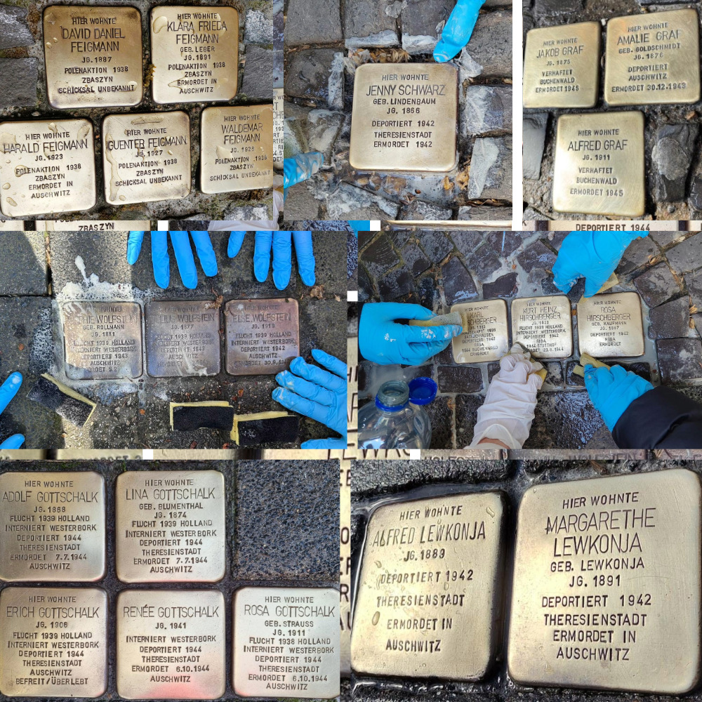 Ganz handgreiflich wurden wir dann in der dritten Phase des Projekttages, in der wir, dankenswerterweise unterstützt von einigen Eltern, in Gruppen zu den einzelnen früheren Wohnorten der entsprechenden Menschen ausgeschwärmt sind. Jeweils vor Ort wurden die Stolpersteine geputzt und wieder zum Glänzen gebracht. - Um noch besser zum optischen Stolperstein zu werden, der an die verfolgten und ermordeten Mensch erinnert.